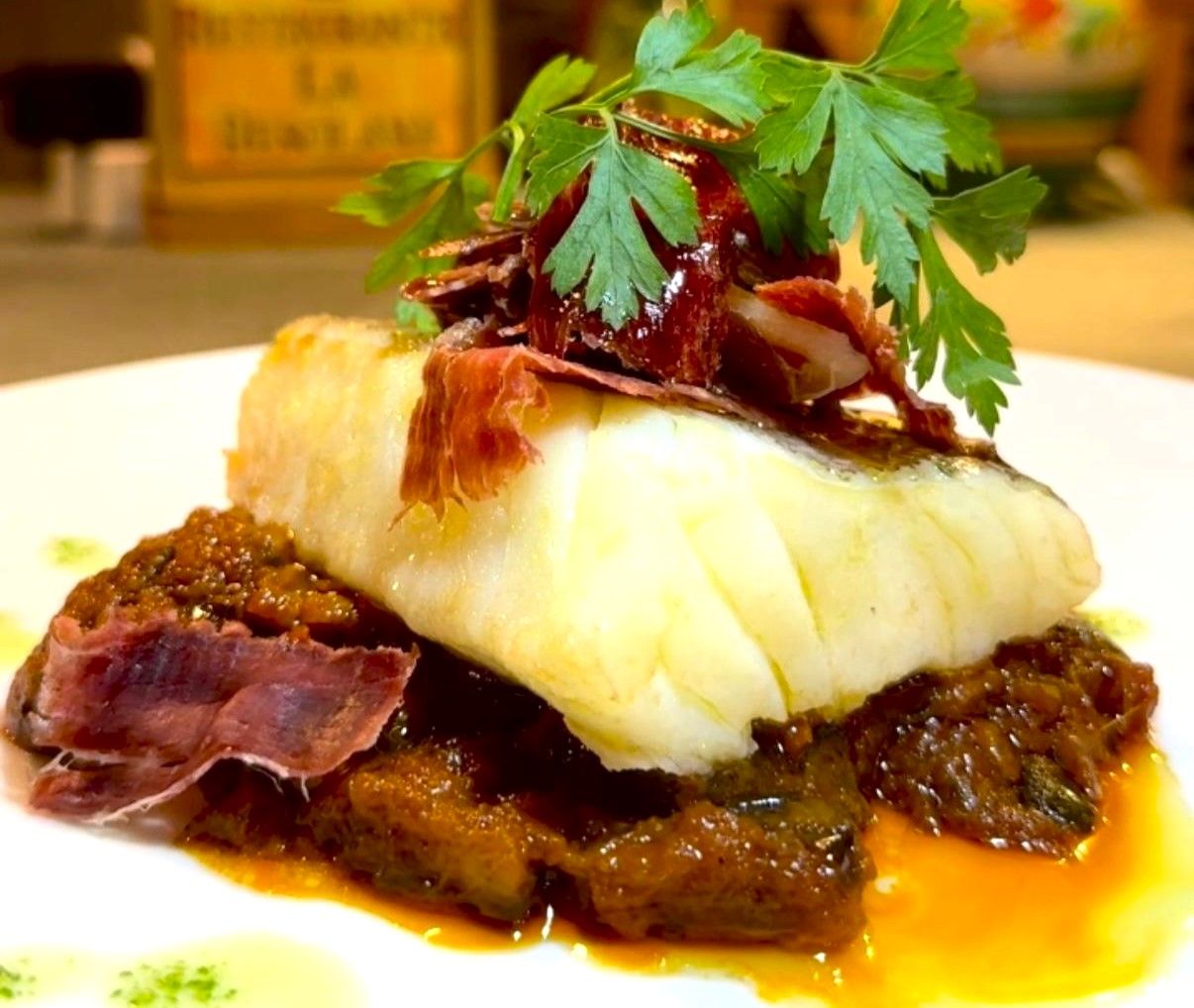 LOMO DE BACALAO SOBRE PISTO Y VIRUTAS DE JAMÓN IBÉRICO--22,50€(250grs+-)
