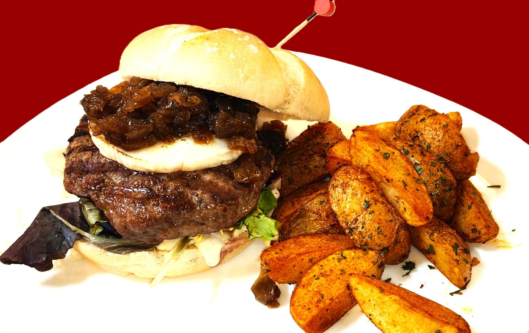 Hamburguesa elaborada en casa con lomo de vaca madurado mas de 60 días .Montada sobre un pan rustico con mayonesa trufada, mézclum ,queso de cabra y cebolla caramelizada ,la cual acompañamos con patatas rusticas al pimentón.