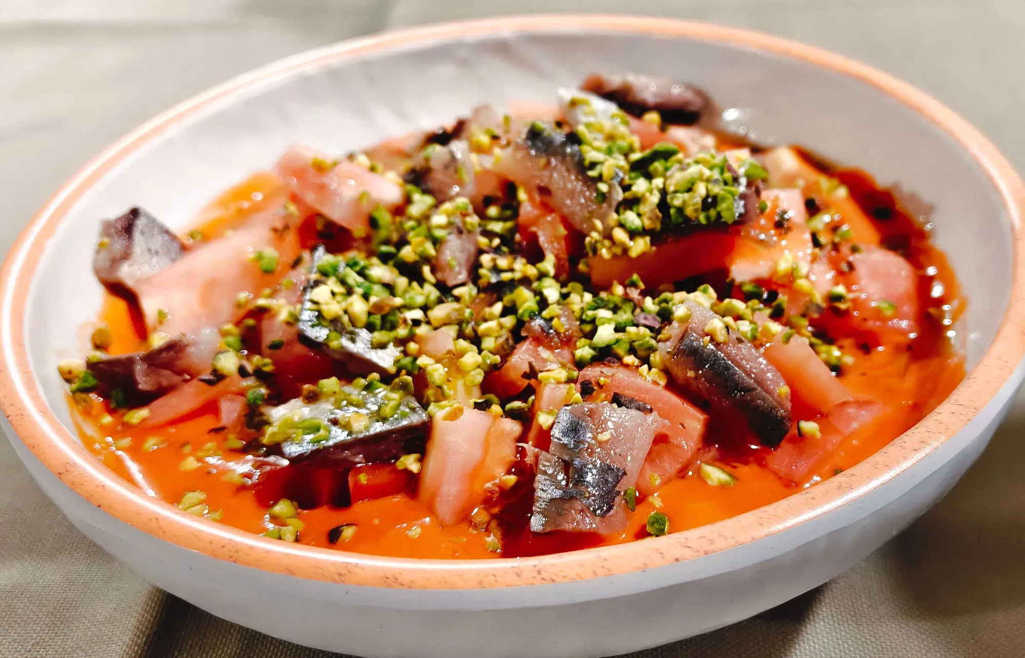 ENSALADA DE TOMATE CORAZON DE TORO SOBRE SALMOREJO Y LOMO DE SARDINA AHUMADA....11,90€